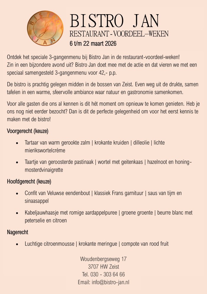Wij vragen 15,- per persooon voor de aanbetaling als garantie van de reservering. Mocht de reservering niet kunnen plaatsvinden, dan wordt de aanbetaling middels een dinervoucher van Bistro Jan terug betaald. De aanbetaling wordt uiteraard in mindering gebracht op de eindrekening.